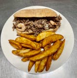 Onions, green peppers, mushrooms, sliced tomatoes & fresh steak.